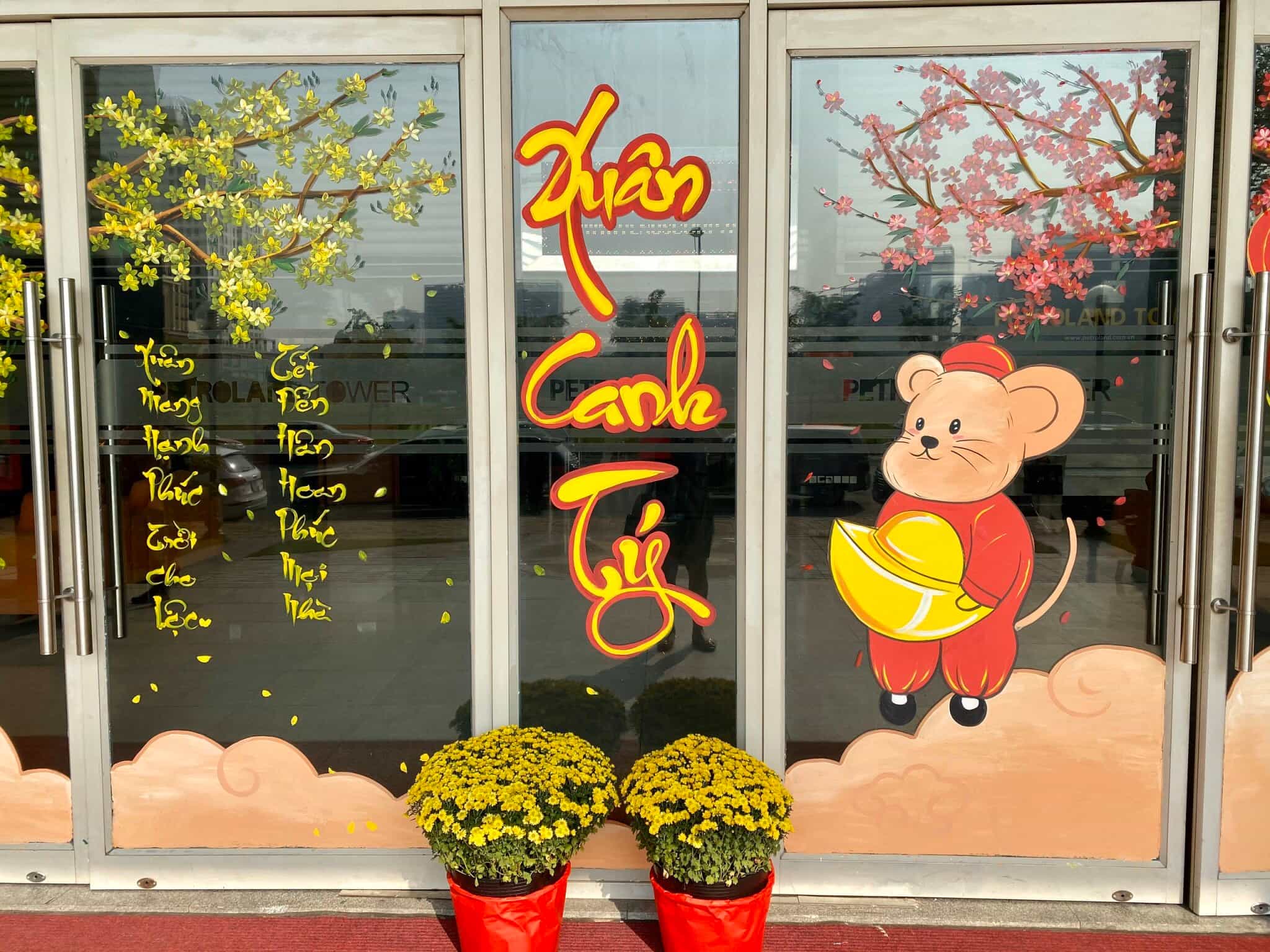 - Tạo không khí lễ hội: Những bức tranh kính đầy màu sắc với hình ảnh mai đào, câu đối đỏ, bánh chưng, và lồng đèn mang đến không gian rộn ràng, đậm chất Tết Việt Nam.
